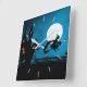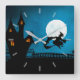 Get into the Halloween spirit with this spooky looking wall clock. A full moon is rising above the creepy and quirky haunted house whit the glowing orange windows. The black silhouette of an evil witch riding on her broomstick is seen above a picket fence. Blues and blacks set the mood for this fun Halloween decor.