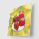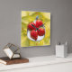 Hand placed, cut out yellow petals form the background for a spoon full of red strawberries and cream. Very very tasty!
