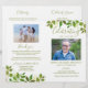 Budget funeral memorial program featuring on the front a photo of your loved one, thier name, dates, the memorial venue, date of the event, and elegant green watercolor foliage. On the inside is an obituary, and order of service; and on the back another photo, a thank you note and the second venue for after the funeral. PLEASE NOTE: These come as a flat piece of quality paper, you will need to fold them yourself.