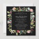Elegant celebration of a life square invitation features a botanical frame of pink and purple flowers along with a variety of trendy foliage. A black background really pops the collors The deceased person's name is written in a traditional script text. All of the text can be easily edited to create a personal remembrance.