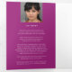 Funeral program order of service in white and mulberry mauve pink in our hearts forever 6-page tri-fold with four photos template holders funeral program. A simple elegant program where you can simply replace the sample text and photos with your own photos and memorial service details. Other matching items and colour options are available. Design by Sarah Trett for www.mylittleeden.com (Photos are placeholder images only for you to replace with your own loved ones).