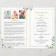 Green and gold themed funeral program with watercolor foliage and a golden border. Easy to edit and customize, this template has a photo collage on the back page with space for 9 photos. The inside pages have an example obituary and order of service but these can be replaced with more photos or your own text, such as poems, song lyrics or a reading.