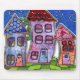 Art by Marta Harvey. This piece was created as a collage of painted papers (junk mail), put together to form these little funky houses. Once they were put together, the windows and other details were added to finish the piece.