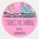 Girls in cute, funky skates of colourful patterns and polka dots are rolling on by in this bright and happy roller skating themed birthday party favour sticker. Coordinates perfectly with our matching invitation: