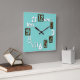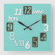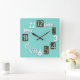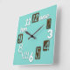 Numbra wall clocks with funky assorted fonts. White, Teal Blue and Brown Wood Grain Texture. Great for college dorm rooms.
