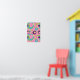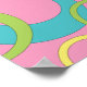 A bright pink background is adorned with a funky pattern of circles, dots, and rings in a variety of vibrant colours, including blue, green, purple, and yellow.