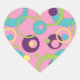 A bright pink background is adorned with a funky pattern of circles, dots, and rings in a variety of vibrant colours, including blue, green, purple, and yellow.