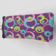 A vibrant purple background is adorned with a funky pattern of circles, dots, and rings in a variety of bright colours, including pink, green, blue, and yellow.