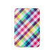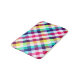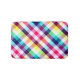 A small sized bath mat featuring a colourful plaid pattern design in rainbow colours.