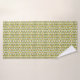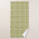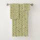 Cet ensemble de serviettes de bain est décoré d'un motif de style rétro en vert olive avec des formes oblongues comme des perles disposées à intervalles le long de lignes verticales droites. Chaque couleur de chaque pièce peut être modifiée dans ce graphique spécial pour un look personnalisé.