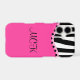 Make a bold statement with this chic iPhone case featuring a striking black-and-white zebra print paired with a vibrant pink lower half. A playful wavy border with black dots separates the two sections, adding a touch of flair. Centered on the pink background is the elegant monogram in a decorative black font, giving the case a personalized and fashionable finish.