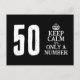 Funny 50th Birthday keep calm postcard template. Fun Keep Calm and Carry On quote for fifty year old. Make your own age specific spoof with custom number. Cute card idea for men or women. Vintage typography template with crown. Black or custom colour. Personalize with message on the back. Create party invites and more.