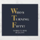 Celebrate your 50th birthday in style and with humour! On a navy blue background, the gold and off white typography reads "Who's Turning Fifty?" with the WTF larger and in gold. Underneath, you can customize the name and date of the birthday, or simply delete the template message and add your own. Unique, cheeky and perfect for the big birthday celebrations!