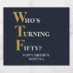 Celebrate your 50th birthday in style and with humour! On a navy blue background, the gold and off white typography at the top reads "Who's Turning Fifty?" with the WTF larger and in gold. Underneath, you can customize the Happy Birthday message with your own name. Unique, cheeky and perfect for the big birthday celebrations!