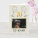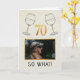 Celebrate the big 70 with a laugh! This humorous 70th birthday card features elegant wine glass outlines, a bold gold '70', and the playful 'SO WHAT!' phrase. The customizable photo frame lets you add a personal picture, making it a unique and memorable card for friends or family embracing their milestone birthday with a smile. Perfect for those who appreciate a bit of cheeky humor on their special day, ensuring your message and photo look vibrant and striking. Make their special day unforgettable!