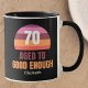 This funny 70th birthday mug features a big "70" in the center of a gorgeous sunset on a black background. The words, "AGED TO GOOD ENOUGH" are right below the sunset. In addition, you can add the name of the recipient. This makes a great mug for the woman with a sense of humor. Copyright Kathy Henis