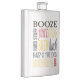 Funny alcohol euphemisms typographic design: booze, juice, grog, hard stuff, brew, hooch, hair o the dog, moonshine, sauce, humourous slang names for drink.