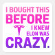 Show off your sense of humor with this high-quality vinyl decal that reads, "I Bought This Before We Knew Elon Was Crazy." Perfect for Tesla owners, tech enthusiasts, or anyone who regrets supporting Elon Musk! This weatherproof bumper sticker is great for cars, laptops, water bottles, and more. Easy to apply and long-lasting—make a statement wherever you go!