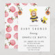 Adorable typography, baby shower design featuring a cute girl teddy bear with a barrel of honey watching a cute honey bee. The fun pink lettered typography is strung at top with cute strings and dangle down. Pink florals and templates to create your own invitation on back.