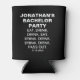 The guys at your Bachelor Party will get a laugh out of this funny can cooler the reads "Jonathan's (change name) Bachelor Party. Eat Drink Drink Eat Drink Drink Drink Drink Pass Out (Date of party). Feel free to change any of the text as it's totally customizable. You can also easily change the background colour. Bold, modern, fun - a perfect party favour for your guys.