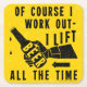 This funny beer paper coaster set shows a grungy image of a hand holding a cold beer bottle with the words, "Of Course I Work Out - I Lift Beer All the Time" done in all black. The background is a golden lager / pale ale colour with light bubbles.