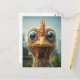 A highly detailed, humourous close-up of a chicken with exaggerated large blue eyes, fluffy feathers, and a goofy expression, set against a soft-focus outdoor background with sunflowers.
