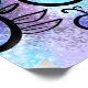 A funny little bird in the upper left corner and floral elements on a pink, purple and turquoise background.