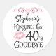 Funny Birthday Kissing A Decade Goodbye Custom Party Stickers. Celebrate a birthday beginning a new decade with these funny party stickers featuring an editable age modern typography design for the saying NAME'S KISSING HER "DECADE" GOODBYE (the sample shows 40s for a 50th birthday). CHANGES: The personalized text font style, colour, size and placement as well as the graphics and background colours can be changed to coordinate with your party theme colours (shown in pink and black). ASSISTANCE: For help with design modification or personalization, colour change, resizing, transferring the design to another product or you would like coordinating items, contact the designer BEFORE ORDERING via Zazzle Chat or makeitaboutyoustore@gmail.com.