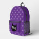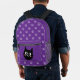 Funny purple backpack featuring a comical cartoon black cat with big round eyes and rosy pink cheeks in a doodle drawing art style. The background is covered in a small paw print pattern.