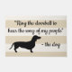 Funny dachshund doormat with the phrase "Ring the doorbell to hear the song of my people" in black script. The background is a taupe and beige stripes pattern.