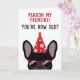 This funny french bulldog birthday card is sure to put a smile on the face of the birthday boy or girl who has a sense of humor. The design features an illustration of a cool looking black colored french bulldog wearing a red party hat and sunglasses with the wording "Pardon my frenchie! You're how old" written on the front.