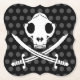 Serve your drinks on these paper coasters with this realistic vector rendering of a Jolly Kitty Pirate Skull and Sabres. The background is black with a grey polka dot.