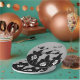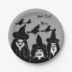 The three funny witches on the front of this cool halloween paper plate is an original and unique, ink drawing. The spooky black witches all have an original appearance but all have funny scary expressions. In the background, flying through the sky there are four witches on broomsticks. The originality of these fun halloween characters makes them really stand out on this halloween paper plate because they are so different from any other witch illustration. This is a customisable spooky witch paper plate, you can personalise it with your own text.