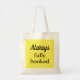 One of two of our budget friendly book tote bags. Fun phrase, "Always fully booked" is set up in a template so you can easily personalize it to your own words if you choose. Whatever words you type in will automatically appear on both front and back. Pretty yellow background on 100% machine washable cotton. We also have this design set up as saying "Forever fully booked". With an easy click, this book carrying bag design can be transferred to other sizes and shapes of tote bags.