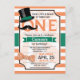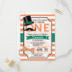 Funny retro moustache, vintage top hat, and bow tie boy's first, 1st, birthday party invite on orange and white stripes pattern. Features green, orange, and white colours. Personalized for your child's, kid's, toddler's, infant's, baby's name. First birthday invitation for boy.