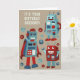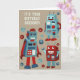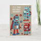 Create a personalized birthday card for a special birthday boy. This card is ready to be personalized with your own custom text on the front and on the inside. The message on the front reads: IT'S YOUR BIRTHDAY, NAME! And the message on the inside reads: SO, GO NUTS! HAPPY BIRTHDAY! But all text can be changed to your own custom text. This card features cute illustrations of retro style robots in shades of red and blue along with some coordinating hex nut graphics against a tan background.