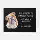 "No need to knock twice, We have a Bulldog" declares this funny door mat. The text is in silver grey at the right side, while an picture of a brown and white Bulldog is at the left. Everything is placed on a black background.