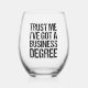 Trust me, I've got a business degree. A graduation humour wine glass gift for a graduate who earned a master of business administration from a college or university. A funny quote from a businessman, businesswoman, or businessperson.