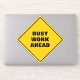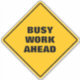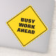 Funny classic yellow diamond caution road sign warns of busy work ahead in a thick black sans serif font. A pun play on words of a classic sign, road work ahead.
