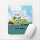This funny geocaching personalized mousepad or mouse mat design has a cartoon with a geocacher reaching and saying, "It should be behind this bush. I'll be the FTF. Woo-hoo!"