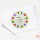 Round customizable funny vegetables sticker with cute and funny cartoon vegetables arranged in a circle and custom text. Red tomato, green broccoli and violet eggplant have an amazed look in their funny big cartoon eyes. This funny sticker would be perfect for cooks and people who love cooking and vegetables.