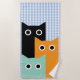 Adorable Beach towel featuring three funny cats. One is black, to the left of the design, one is orange, slightly lower and to the right of the black cat, slightly in front of it and one is teal, lower than the other two cats and standing in front of them. The only feature on the cats ar big round eyes.