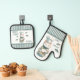 Cute oven mitt and pot holder set featuring an illustration of a funny kitty preparing fish. Great for a anyone loving seafood, cats or the beach.