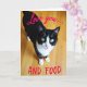 This card shows a black-and-white tuxedo cat lying on a honey-colored wooden floor, looking up at you with wide yellow-green eyes. Its face has a white muzzle and a small pink nose, and long white whiskers that stand out against the dark fur. The cat’s chest and paws are bright white, almost like little mittens resting on the floor. At the top of the image, the words “Love you…” appear in hot pink script that curves gently across the card. Below that, “AND FOOD” is written in red block letters, making the joke clear and easy to read. The simple background keeps all the attention on the cat’s sweet, expectant expression and the funny message ❤️💌. It’s a lighthearted way to say you care (and maybe share a treat) 🍫, and it’s great for sharing Valentine’s Day.