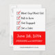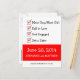 This funny Save-the-Date postcard features a checklist of important events that lead up to the big day. Text is black on white and white on red. Alternate version available in pink and blue: