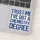Funny chemistry graduation sticker that reads Trust Me, I've Got a Chemistry Degree. A cool chemistry major or scientist gift for a science graduate, chemistry teacher, or professor.