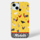 This funny chicken phone case has a Memphis style look with a chicken farm theme. Modern geometric patterns are used in the design to colour roosters and chickens in a pastor with a yellow chicken wire background. There are two big roosters and ten lovely hens in this pattern. A fun updated chicken pattern for a modern country look. Perfect for anyone that is chicken crazy. You can make the pattern larger or smaller on this phone case. Personalize the case with your name. This makes a great gift for anyone that loves chickens and modern design.