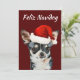 This funny holiday card features a realistic watercolor Chihuahua sporting a Santa hat on a rich dark-red background — topped with customizable “Feliz Navidog” text for maximum giggles.