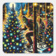 Bigfoot decorating Christmas trees in the forest with ornaments and Christmas lights. Moon shining through the trees. Add some sasquatch humour to your Christmas with these comic book style stickers.