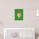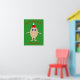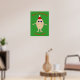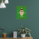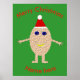 This poster features a funny cartoon of an egg with arms and legs. The egg has arms and legs and a small crack in its head exposing the white inside. It has blue eyes with a black pupil and a big smile where the yolk of the egg can be seen. The eggshell looks rough. This Christmas egg is wearing a santa hat ready to party this holiday season.